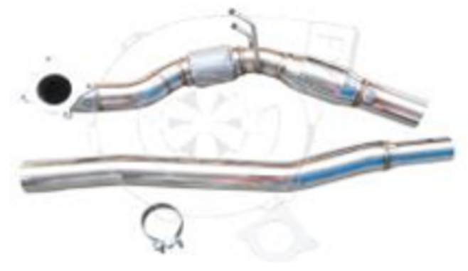 Даунпайп выполнен из высоколегированной нержавеющей стали, со Спортивным Катализатором (200 ячеек на кв. дюйм) и предназначен для установки на Полноприводные и так-же Переднеприводные автомобили концерна VAG с поперечно расположенным мотором 1.8/2.0T от 2005 года. Имеет входной диаметр — 76 мм и выходной 60 мм под оригинальную заднюю часть выхлопа для моторов 2.0 или 55мм для моторов 1.8